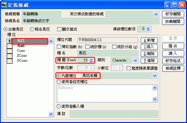 | 4. | 在這檢視中建立 5 個欄位:馬匹、馬齡、Conv、SConv和GConv。有關這 5 個欄位的定義,請看以下圖片: |
