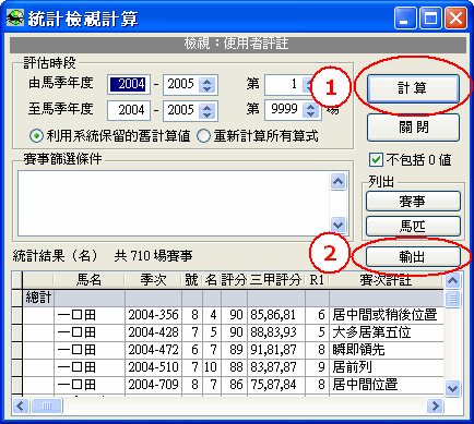 在上圖的表單中按 [統計] 鍵,您將會見到下圖的「統計檢視計算」表單,把評估時段設定為 2004-2005 第一場至 9999 場,按 [計算] 鍵後,結果將會顯示在表單下半部的統計結果表中。