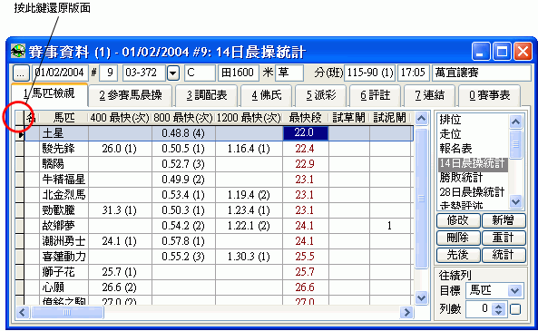當您修改過資料表的版面設定 (例如移動欄位、修改欄寬、排序等) 之後,假如您想把版面還原至最原紿的版面設計,您可以用滑鼠按資料表左上角的還原鍵,系統將會顯示一表單要求您確定您是否要還原版面設定,回答「是」確定還原。